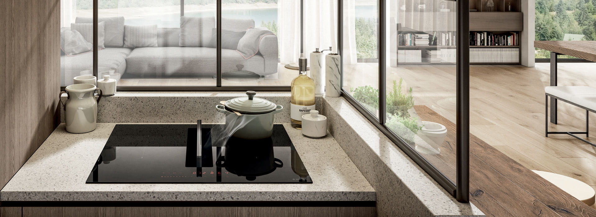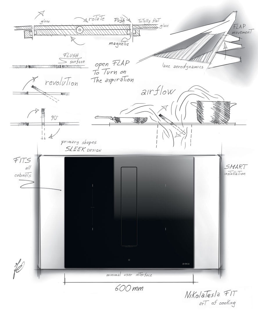 Nikolatesla FIT pozwala na maksymalną elastyczność w projektowaniu. Płyta oferowana jest jako wyciąg lub pochłaniacz rozwiązując w ten sposób wszystkie problemy związane z instalacją i aranżacją przestrzeni w kuchni. Nie trzeba przy tym rezygnować z wydajności i mocy okapu oraz rozmiarów strefy gotowania, także w szafkach o szerokości 60 cm. Jeśli nie korzystasz z pochłaniacza, powierzchnia płyty jest idealnie gładka; do jego aktywacji wystarczy lekkie wciśnięcie części centralnej.