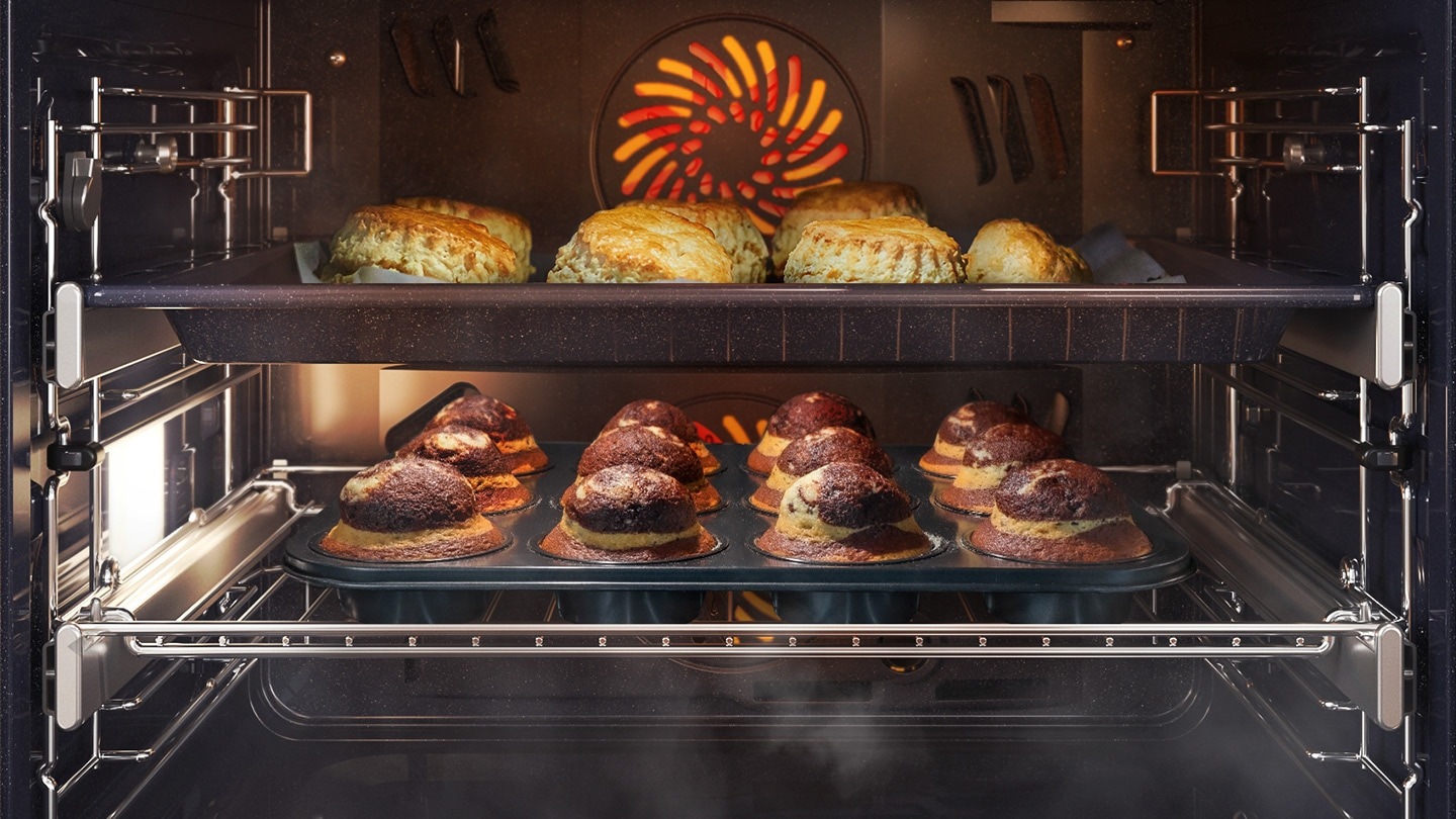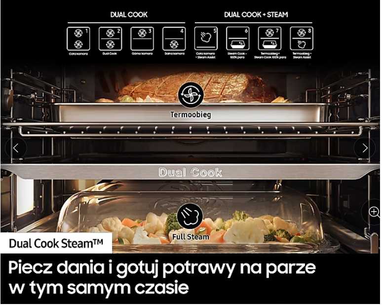 Dzięki wyjątkowemu separatorowi Dual Cook można podzielić przestrzeń piekarnika na dwie komory i w tym samym czasie piec dwie potrawy, w różnych trybach i temperaturach, bez przenikania się zapachów. Można również oszczędzić energię i czas piekąc tylko w jednej komorze.