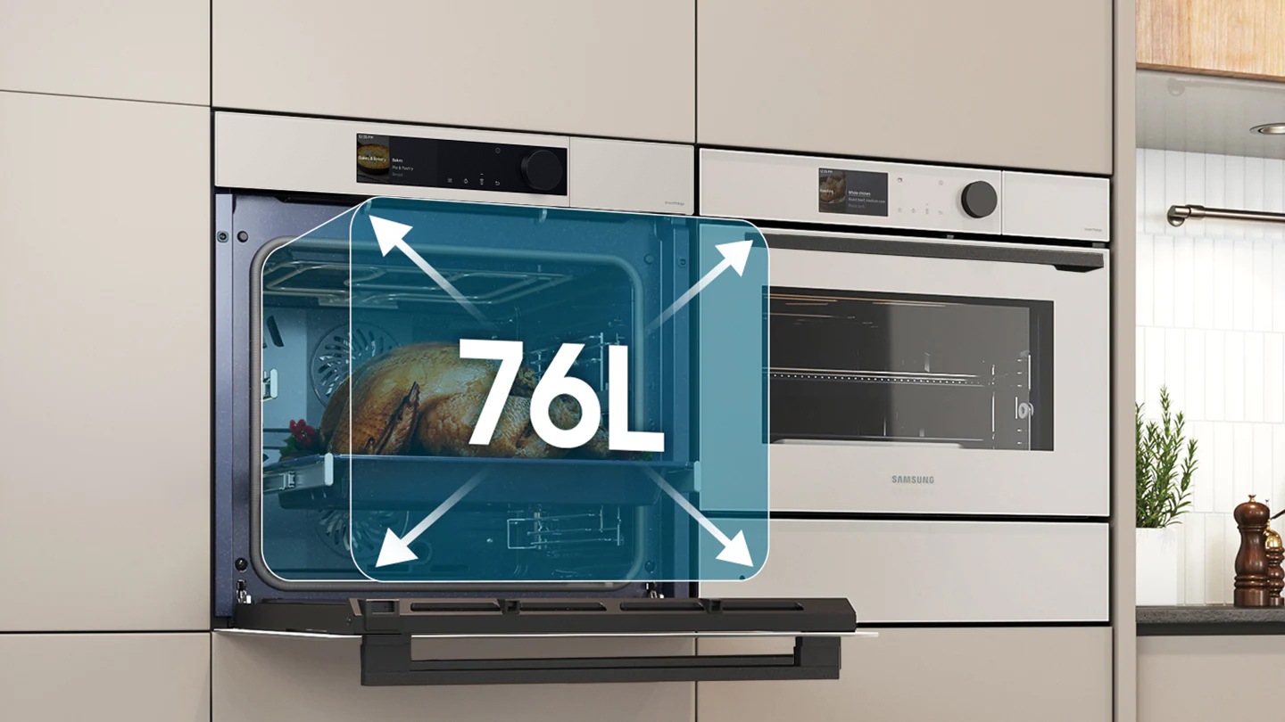 Pojemność aż 76L ułatwia przygotowanie potraw o dużych rozmiarach lub ich większej ilości. Stwarza to nowe możliwości podczas gotowania. Przygotowując przyjęcie, można z łatwością przyrządzić różne rodzaje potraw w jednym czasie. Piekarnik spokojnie pomieści nawet tak duże potrawy, jak sporych rozmiarów indyk, zaplanowany na rodzinne spotkanie.