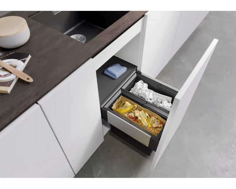 Nie ma potrzeby optycznego ukrywania systemów segregacji odpadów. Ciemne tworzywo sztuczne w połączeniu z aluminiowymi elementami zapewnia stylowy, nowoczesny wygląd.
