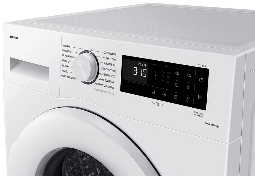 Programy suszeniaBawełna, Delikatny, Pościel, Ręczniki, Syntetyki, Wełna, Mieszane, Do prasowania, Ciepłe powietrze, Czasowy, Odzież wierzchnia, Suszenie 35', Zimne powietrze, Programy z aplikacji
