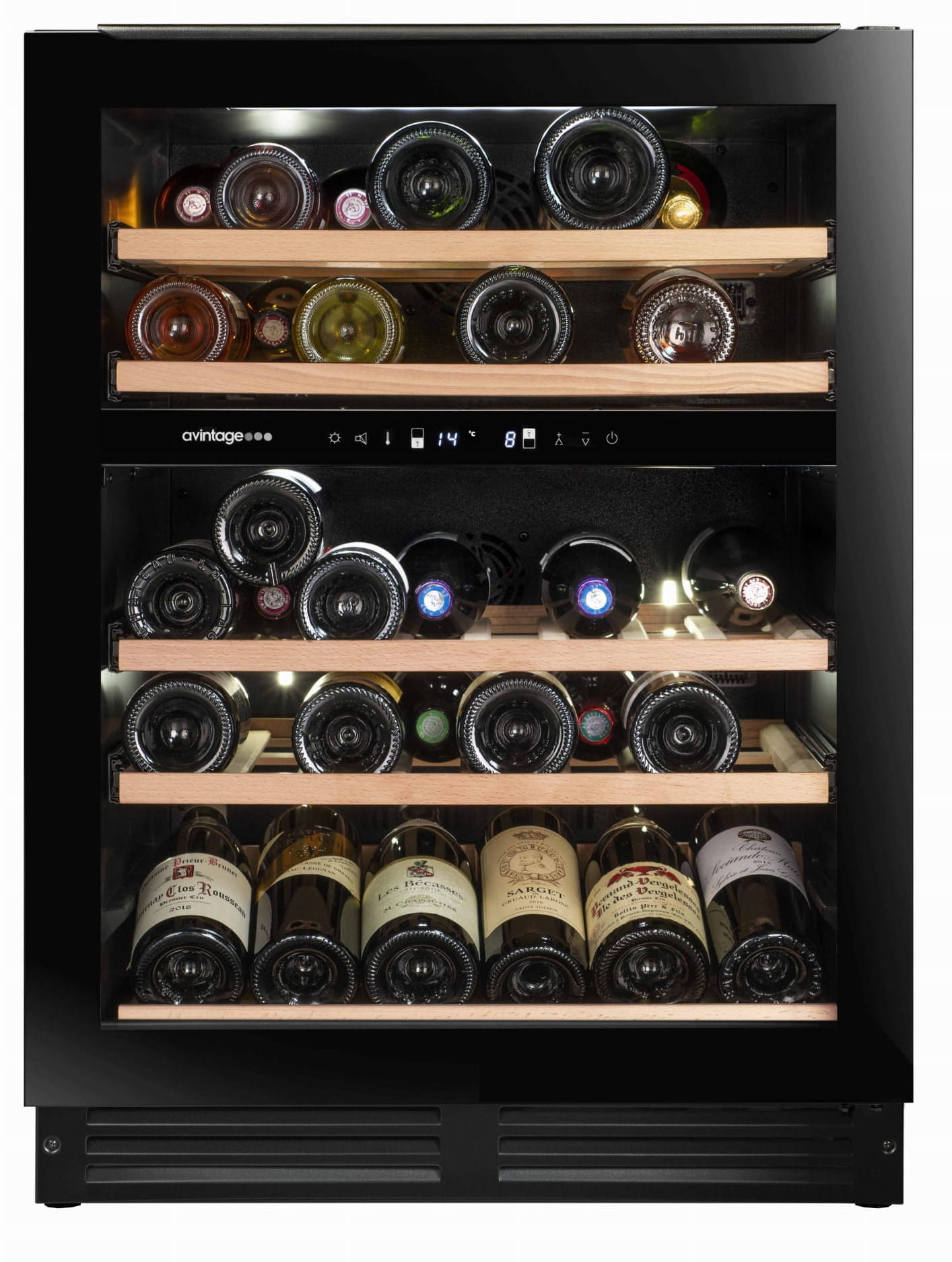 Winiarka AVU51D82 do zabudowy. Dwustrefowa, o pojemności do 44 butelek. Płaski uchwyt umieszczony jest na górnej ramie drzwi.